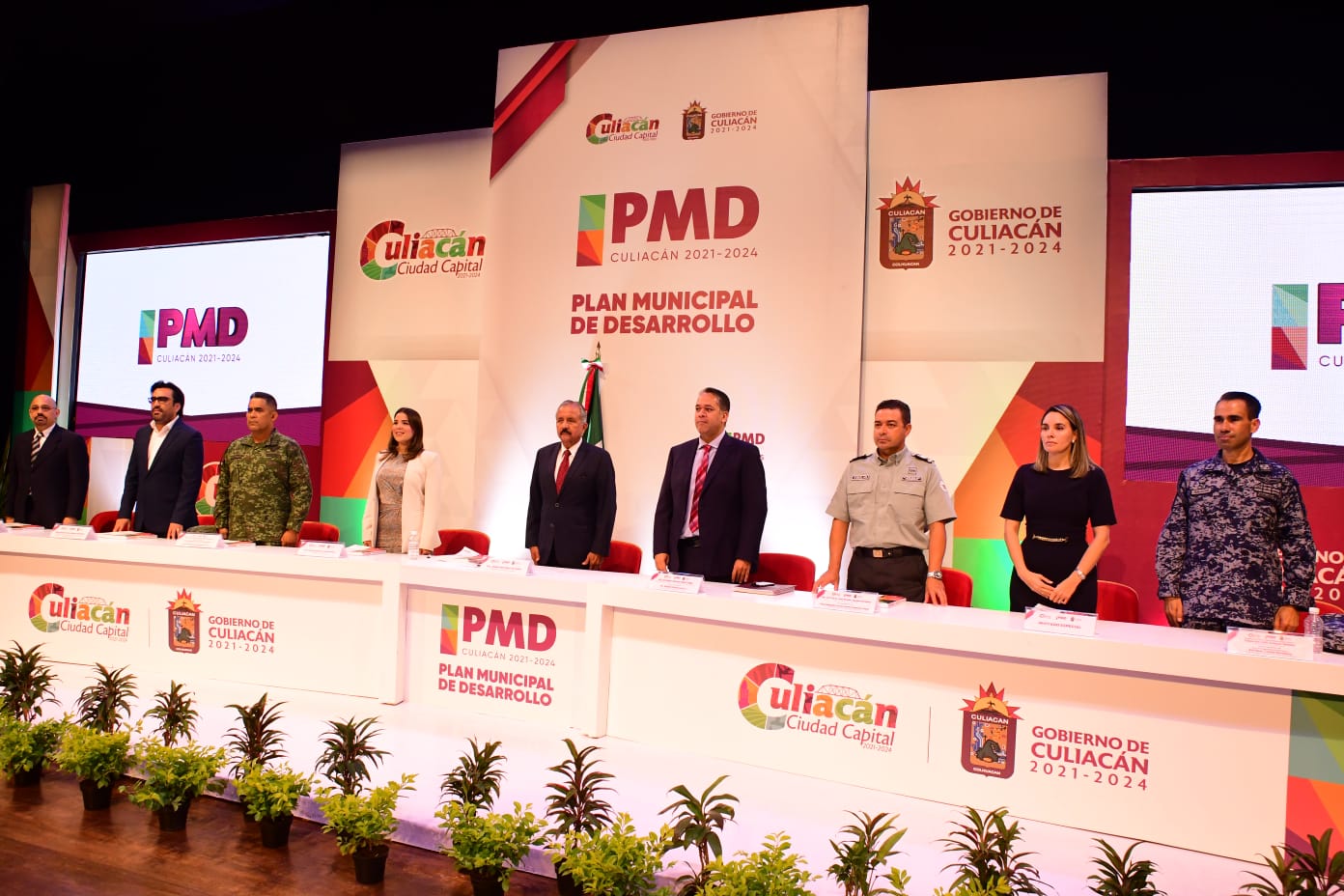 Culiacán, Sin., a 31 mayo de 2022.- Ante representantes de los Tres Poderes de la Unión en Sinaloa, organismos empresariales, instituciones educativas, autoridades militares, asociaciones civiles y sociedad en general, el alcalde Lic. Jesús Estrada Ferreiro presentó el Plan Municipal de Desarrollo 2021-2024.