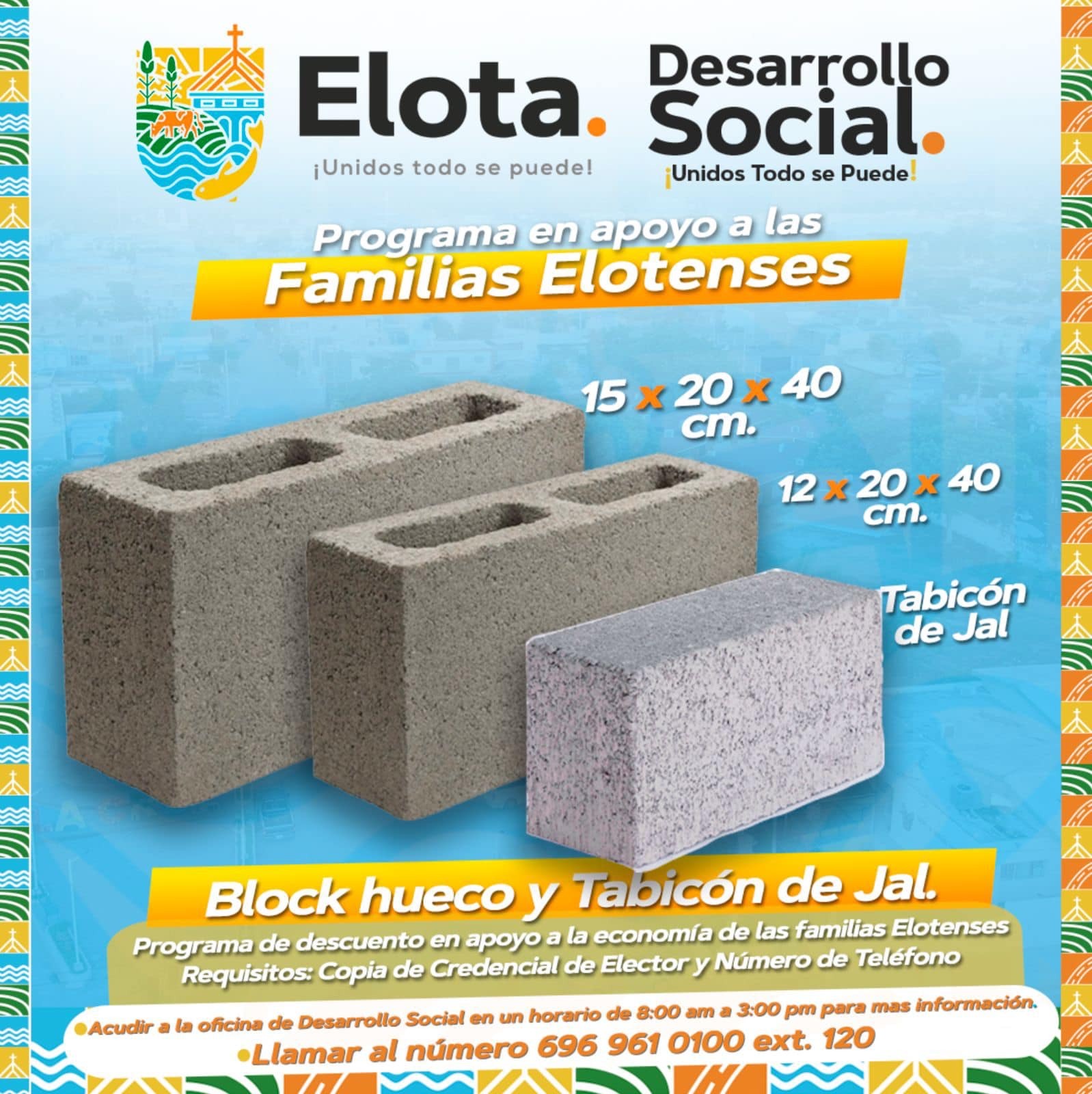 El Programa en Apoyo a Familias Elotenses, que se llevará a cabo de manera permanente, incluye subsidios de hasta un 50% en cemento, mortero, block hueco y tabicón de jal