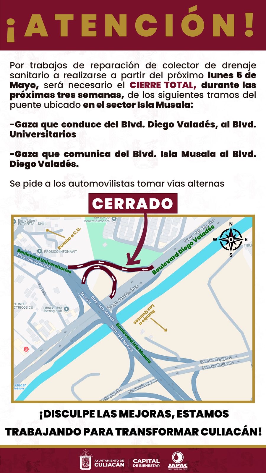 La Junta Municipal de Agua Potable y Alcantarillado de Culiacán informa que, a partir del lunes 5 de mayo, se iniciarán trabajos de reparación de un colector de aguas residuales de 36 pulgadas, que presenta colapso, en el sector Isla Musala.