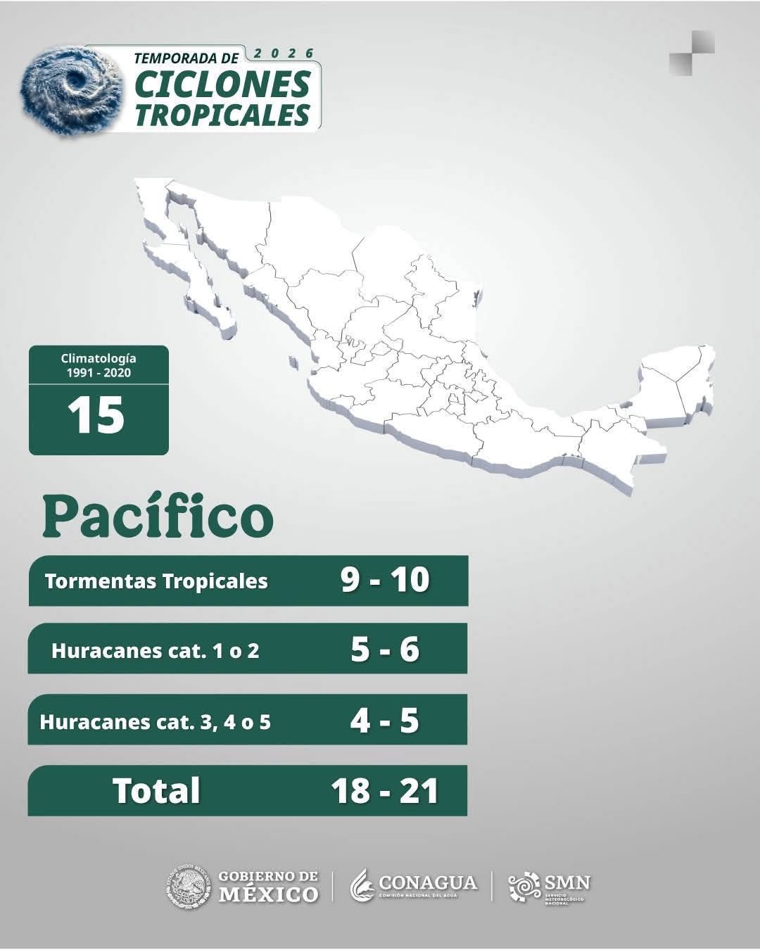 Durante el encuentro nacional, autoridades presentaron el pronóstico para la temporada 2026 en el Océano Pacífico, donde se estima la formación de entre 18 y 21 sistemas meteorológicos. De ese total, se prevé el desarrollo de 9 a 10 tormentas tropicales, de 5 a 6 huracanes de categoría 1 y 2, así como de 4 a 5 huracanes de categoría mayor, es decir, entre 3 y 5.