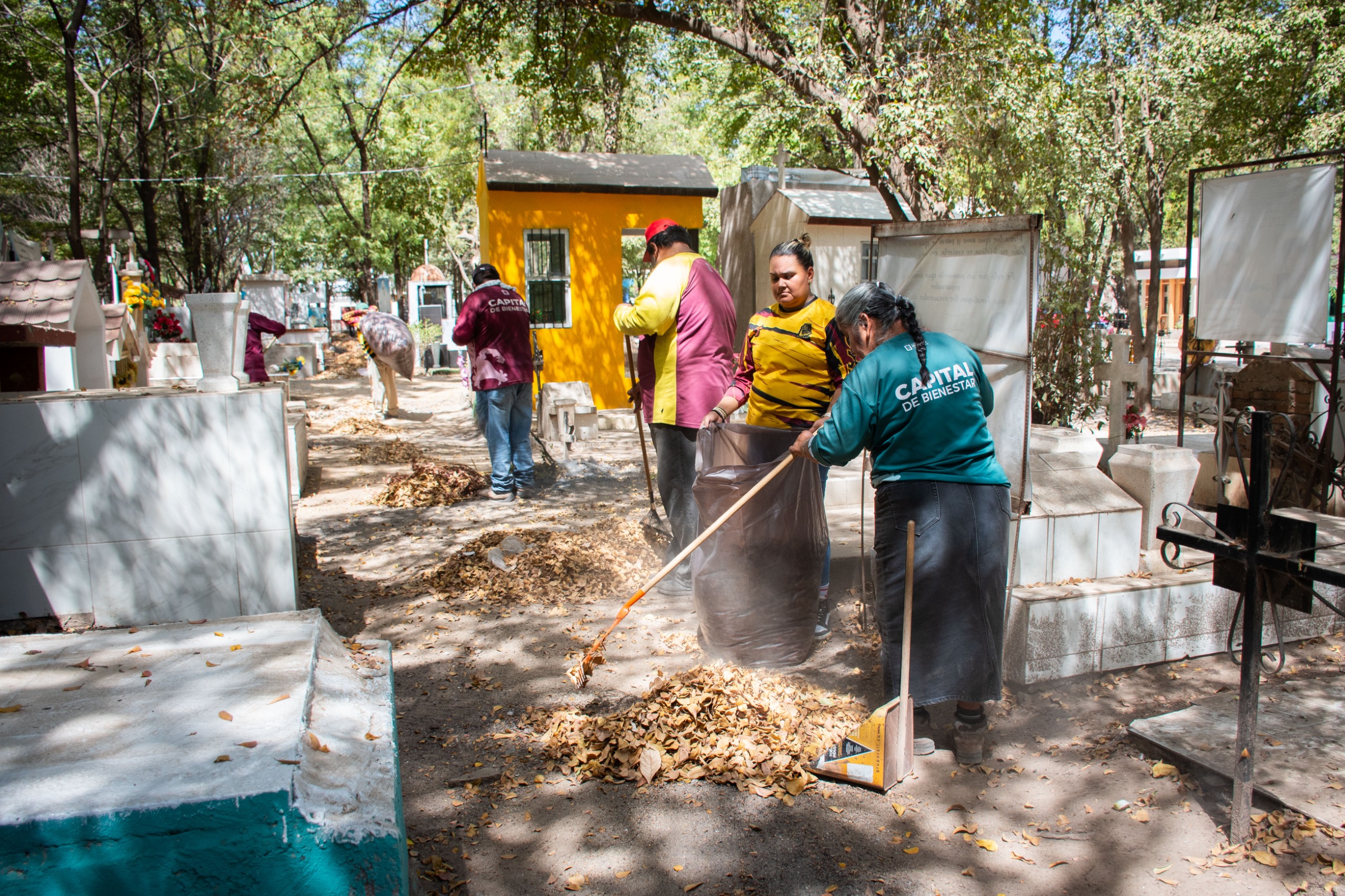 Detalló que actualmente se realizan trabajos de retiro de hojarasca, vidrio, basura en general y escombro, logrando recolectar semanalmente alrededor de 12 toneladas de desechos. Estas acciones se llevan a cabo en los panteones Civil, 21 de Marzo, La Lima, Loma de Rodriguera, Del Barrio, Bachigualato y San Juan.